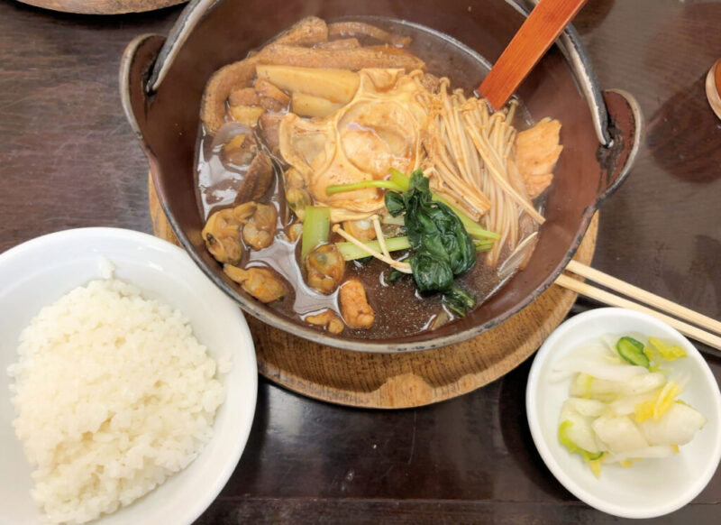 八丁味噌で味付け、具材は鶏肉とえのき、油揚げ、小松菜、あさり